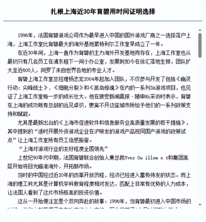 但育碧和不少外企大厂不同的地方在于它们不仅看重中国庞大的市场潜力,也看重中国的人才储备与相对低廉的人才成本。所以当时的育碧更重要的工作,是在中国搭建一个生产基地。而这个想法,也和当时急需引进高新技术、推动信息化发展的上海市政府一拍即合。